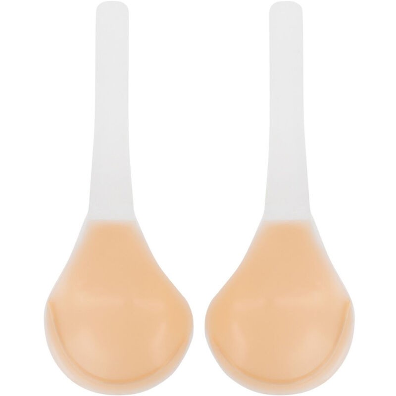 Clear your skin of any oil and creams. Once done, dry your skin with a soft towel. Remove the protective film from the cup and the transparent strap. Flip the cup outward while holding the transparent tape by its end with one hand. Position the cup at the desired breast angle and gently press the cup edges with your fingertips. Then pull the transparent strap in an upward direction over your shoulder. When the desired position is achieved, stick the strap to the skin. Repeat the same procedure with the other breast. Press both cups firmly on the breasts for an optimal adhesive effect.