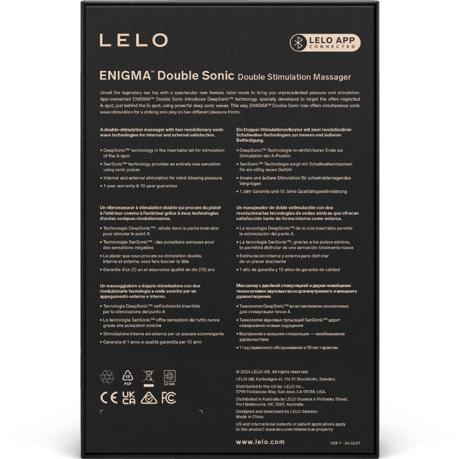 The ENIGMA™ Double Sonic A-spot vibrator is the latest addition to the LELO ENIGMA™ range. With it, we introduce you to DeepSonic™ technology, which focuses on the often-neglected A-spot. It also features eight pleasure modes and two more exclusive app-control modes that you can use when you connect to the LELO app. Thanks to its special sonic tip, located in the insertable tail, ENIGMA™ Double Sonic stimulates a wider erogenous zone to reach the A-spot with its deep sonic waves and give you more intense vaginal orgasms. It also sends sonic waves to the clitoris, as well as vibrations to the G-spot.